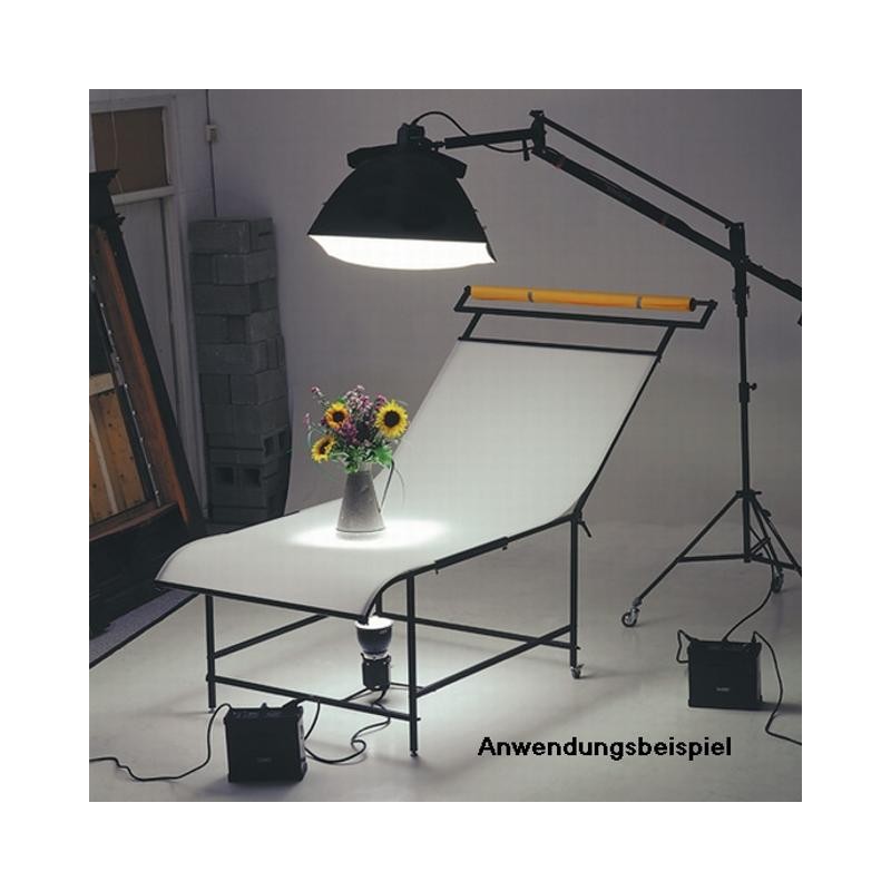 Er hat einen verstellbaren Rückrahmen und eine verlängerte Front für Aufnahmen aus einem extrem flachen Winkel, sowie eine Querschiene mit Hakenfür eine 135cm Hintergrundrolle.