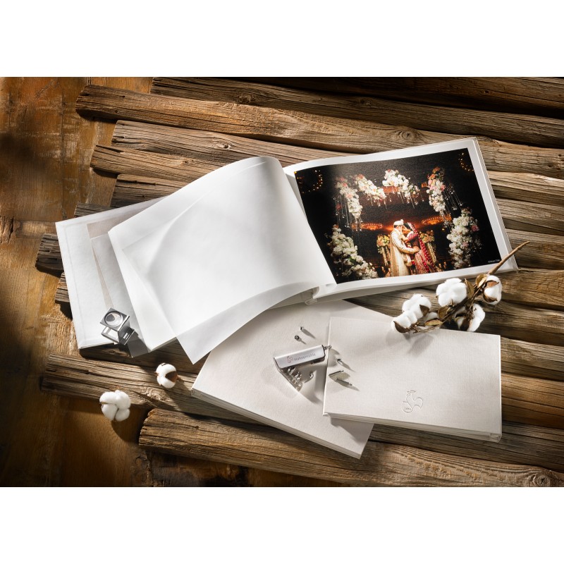 Gewählt werden kann zwischen drei verschiedenen Formaten: DIN A4 quer, DIN A3 quer und 12 "x12" (30,5 x 30, 5 cm) quadratisch. Alle Formate und Farben können mit vier verschiedenen Photo Rag® Papierqualitäten für den Druck der Albuminhaltsseiten frei kombiniert werden. So können höchst individuelle und langlebige Fotoalben erstellt werden.