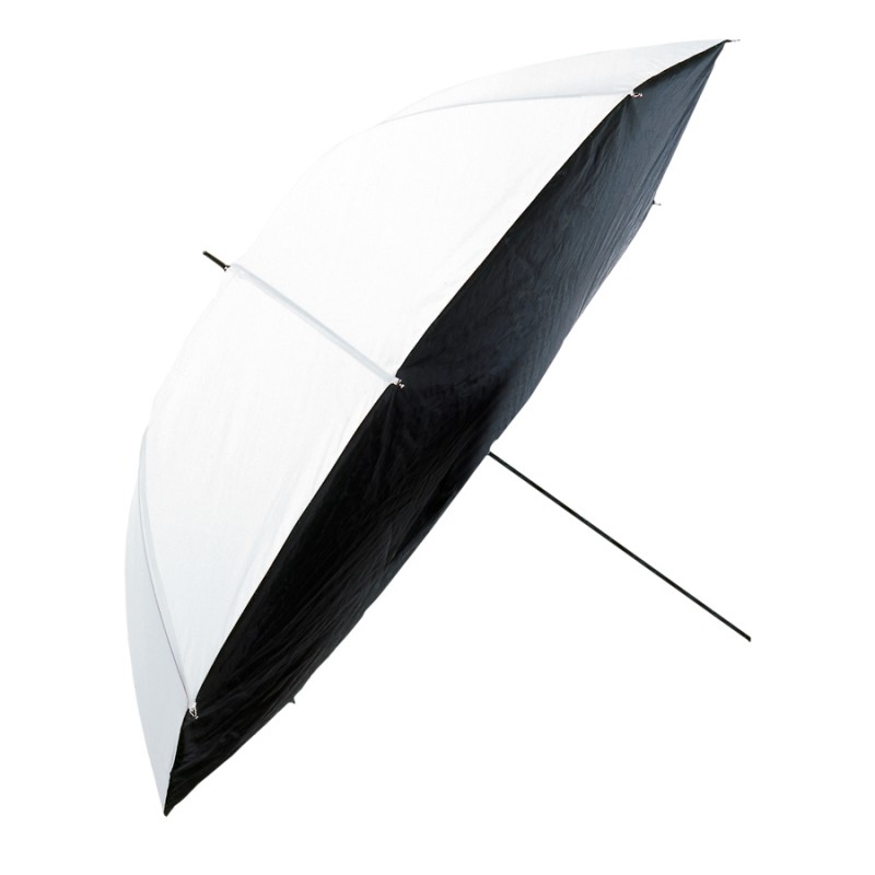 Vereint die Vorteile von Schirm und Softboxen, besonders einfache Anwendung. Weiß, Öffnung abgedeckt mit Reflektorstoff in schwarz/silber, Ø 105 cm